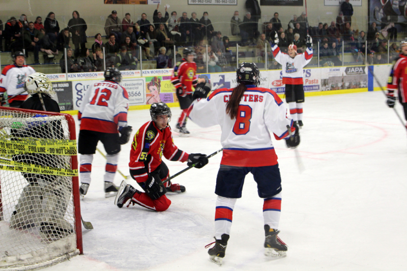 In an effort to raise funds for the Kinsmen/Kinette Christmas Hamper program, the ABA decided to add something a little different this year by hosting a hockey game donned ‘Hockey for Hampers.’ The game saw the CFCW Critters play hard against the Parkland County Hometown Heroes in a game full of crazy antics that had the crowd of over 800, laughing hysterically for 3 very full 15-minute periods.